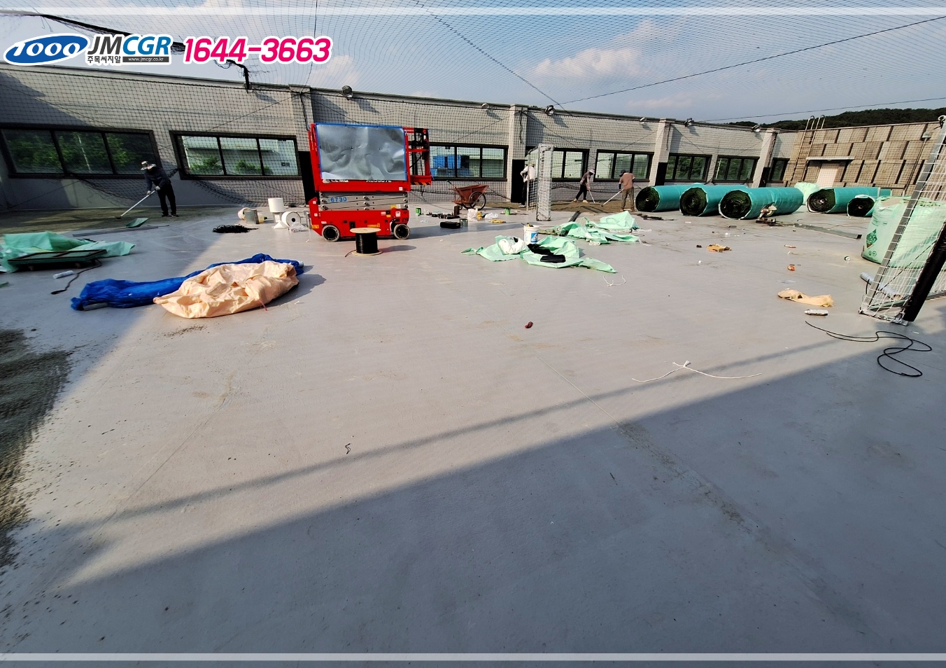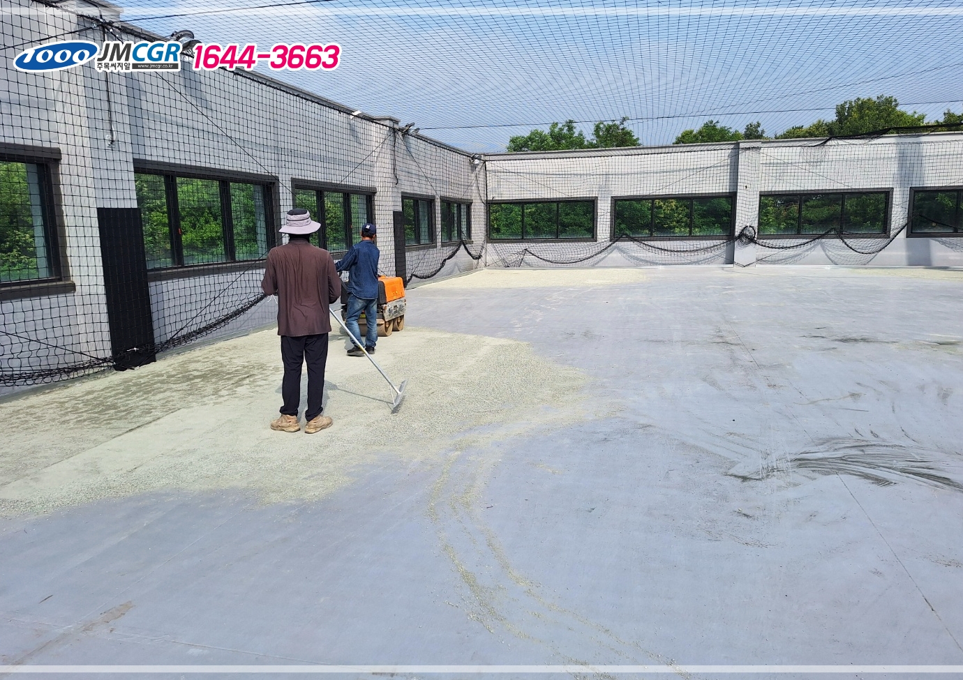 옥상 바닥은 일반적으로 평탄하지 않거나 물고임이 있는 구간이 많기 때문에, 시공 전 철저한 보수 작업이 필요합니다. 이번 기