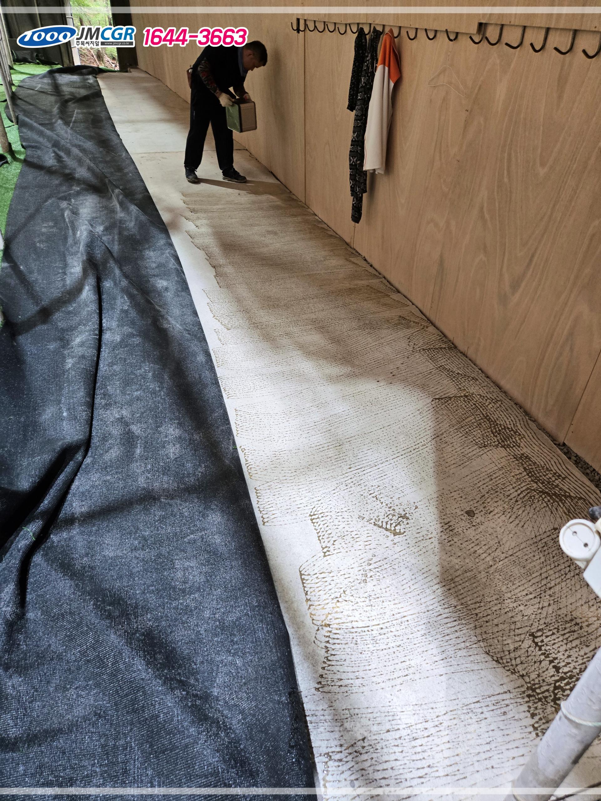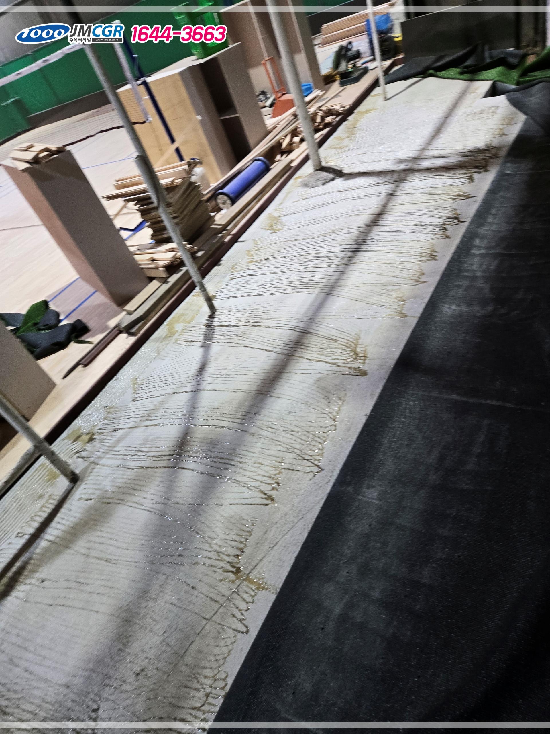 오늘 소개할 시공사례는 서울의 한 배드민턴인데요, 배드민턴장 코트 외부의 통로구역의 콘크리트 노출로 인조잔디 시공한 사