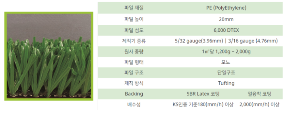 파일 높이 20mm, 6,000DTEX의 모노필라멘트 원사로 구성된 이 잔디는 보행용 공간에서도 충분한 쿠션감을 제공하며, 표면