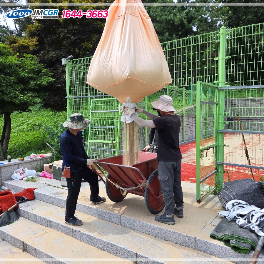 게 됐습니다. 이 인조잔디는 규사가 밖으로 나가지 않게 만드는 역할을 하는데요.
