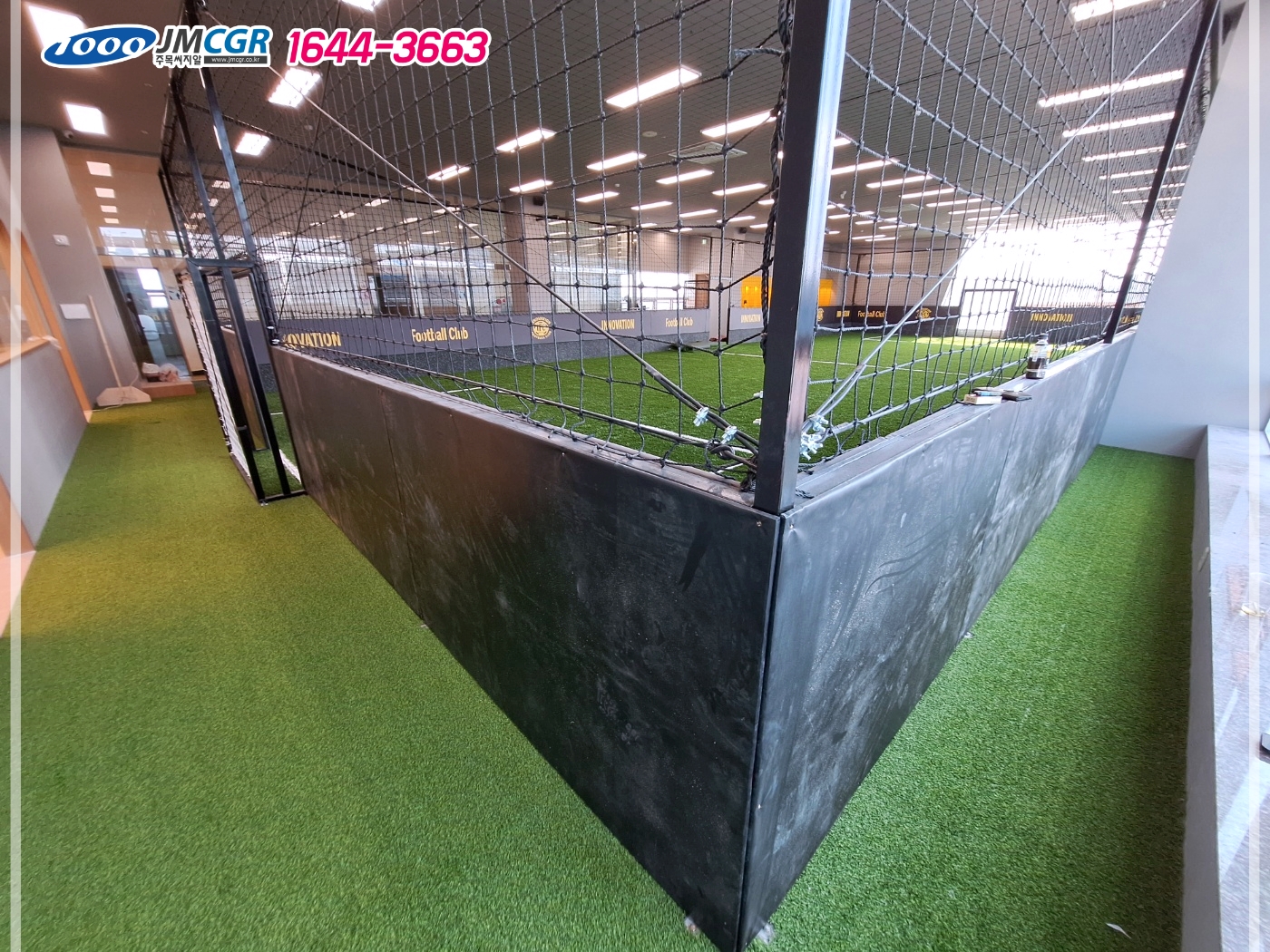 확보합니다. 또한 경기장 상단에는 고강도 그물망을 설치해 공이 외부로 튀어나가는 것을 막습니다. 안전성과 내구성을 동시