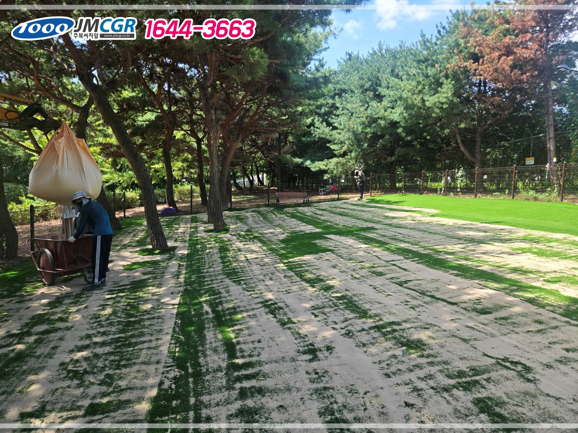 이런 문제를 해결하기 위해 저희는 스포츠용 인조잔디20mm로 일산 정발산 인조잔디 시공을 하고 규사 충진재를 더해 마무리